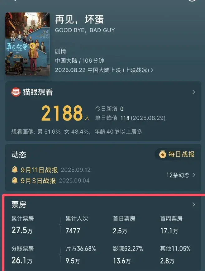 咫尺,电影还莫得上映,然则如故和其他电影一齐开了预售,望望电影的预售情况吧。