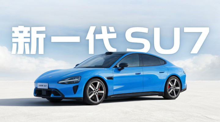 小米SU7汽车 :蓝色小米SU7汽车,布景配“新一代SU7”字样