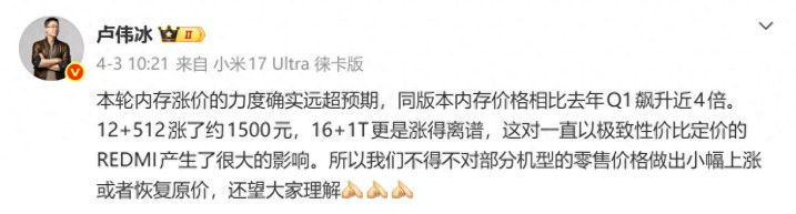 卢伟冰微博截图 :卢伟冰阐明Redmi机型加价原因的微博