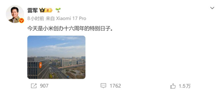 雷军微博截图 :雷军发布的小米创办十六周年微博内容