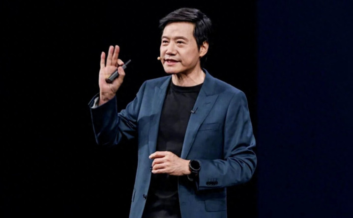 雷军 :雷军身着深蓝色西装,手持发话器手势发言