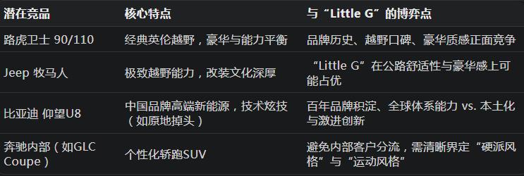预测价钱在60万到70万元之间,让车辆在上场之后就也曾领有了更好的筹码,标的竟然很明确,主要的敌手等于路虎卫士90,路虎卫士110还有吉普牧马东说念主Rubicon高配版、以及丰田酷路泽LC300初学版这些车型。在我看来,飞奔Little G主要的优点就在于品牌溢价,还有豪华质感。以致有一部分东说念主可能会追求个性的良马X3/X4 M、保时捷Macan,在此时也会被小G的经典造型和品牌魔力所眩惑。飞奔Little G真实要警惕的并不是这一些车型,而是中国品牌的高端新能源硬派越野车,举例比亚迪仰望U8,东风猛士917等等。这些国产车在电动越野本领上的创新,竟然让东说念主咫尺一亮,会有原地掉头,还有浮水模式,让电动越野的体验就领有了一个新的冲破。