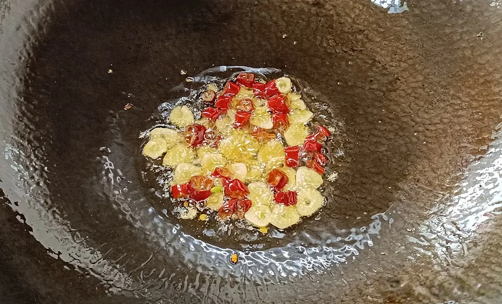 【姿色五】:锅中放入一勺油和一勺荤油,把油烧热,放入蒜末和干辣椒,小火炬调料炒香。