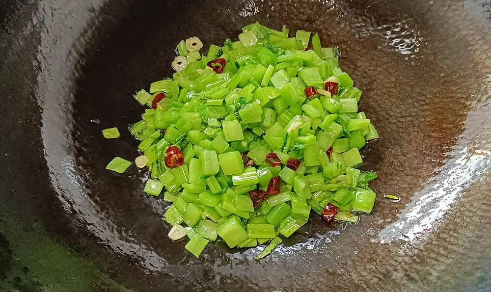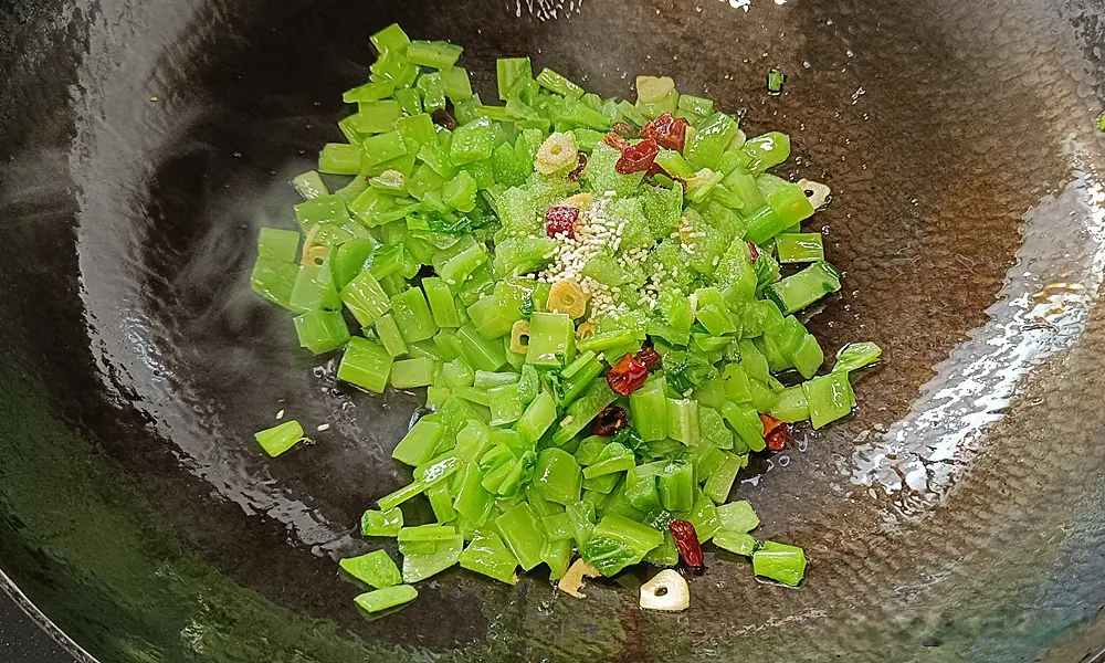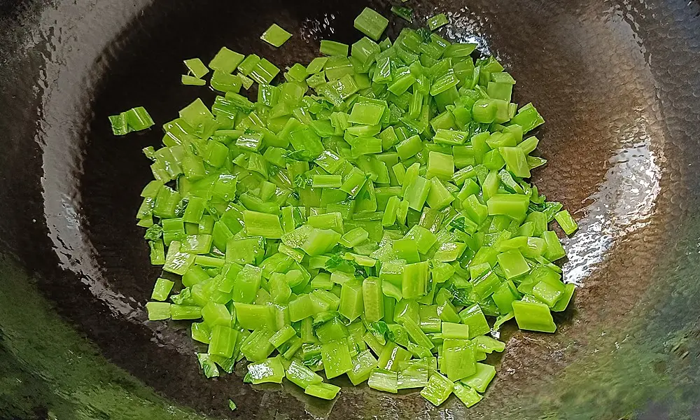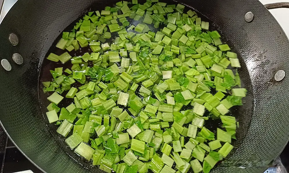 (2)切完的青菜要用沸水焯一下,同期放入一丝盐和植物油,这么可以让青菜保持翠绿的神气。