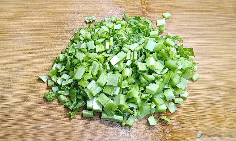 【姿色一】:把大青菜叶子切掉,留住青菜杆,清洗干净,然后改刀切成颗粒装盘备用。