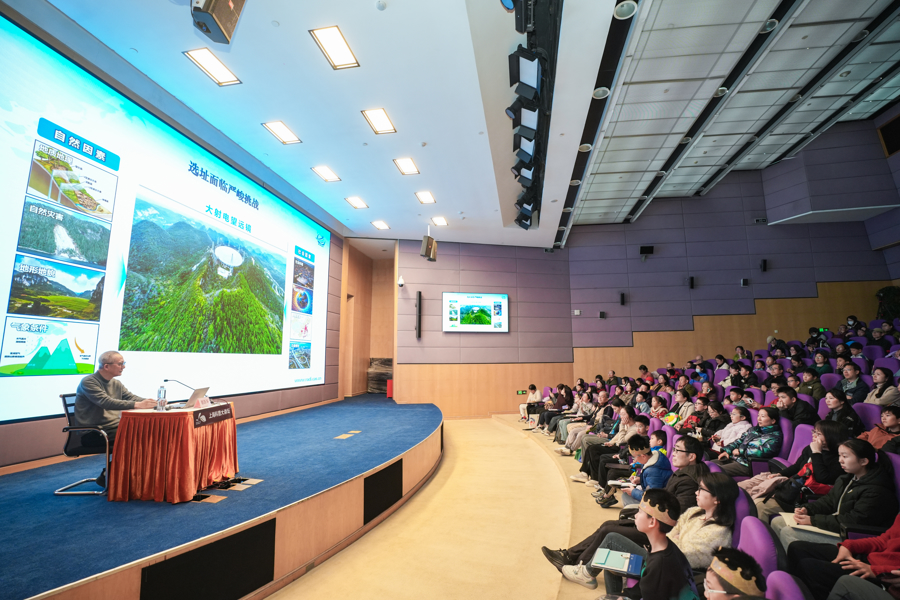 现场,聂跃平以“在贵州深山仰望星空”为题,携带不雅众揭开“中国天眼”背后的选址故事。他先容了团队若何利用遥感技能、地舆信息系统与空间定位技能等,辘集繁重的郊外勘探,历时十余年,在贵州数见不鲜个岩溶凹地中找到了平塘大窝凼凹地,为“中国天眼”的建造打下坚实的基础。