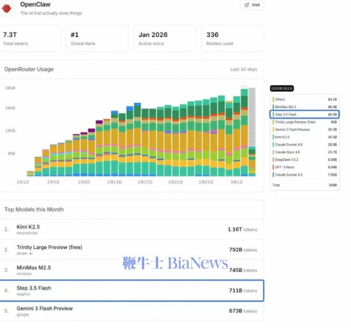 公开数据露馅,在往时一个月内,Step3.5Flash在HuggingFace落魄载量杰出30万次,并登上OpenRouterTrending榜单首位。左证适度2026年3月2日的公开统计,该模子在OpenClaw平台保执前哨排行。