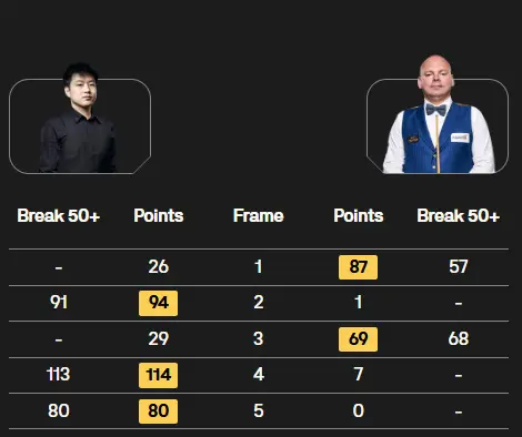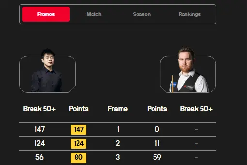 {jz:field.toptypename/}数据方面,赵令郎轰出一杆破百(113分)和两杆50+(81分、80分),宾汉姆打出两杆5-+(57分、68分)。这场比赛第一局,宾汉姆开局领先发力,他打出单杆57分,87-26先胜一局,1-0向上。
