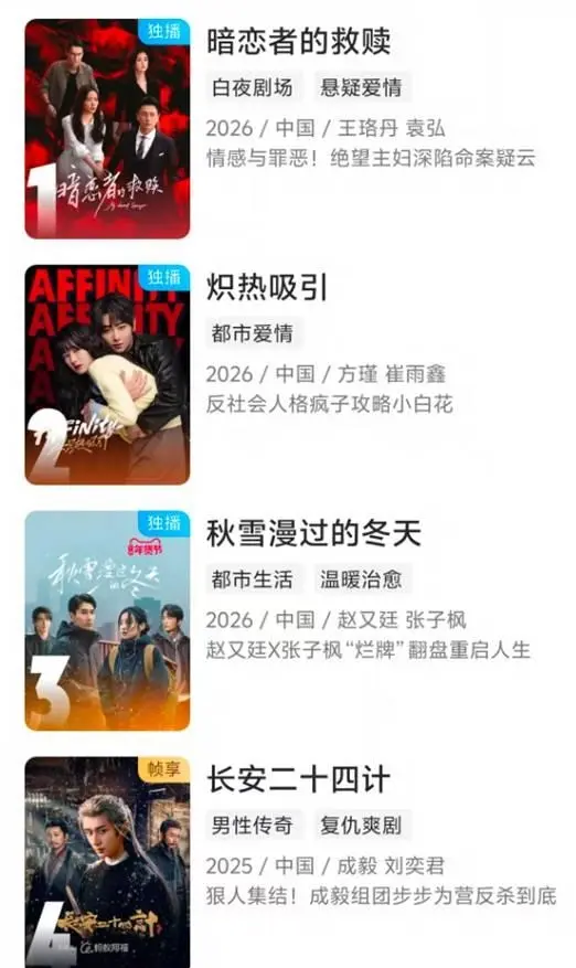 2026年的国产刑侦剧,刚开年就玩起了“循序狂飙”。前有《罚罪2》的硬核扫黑引爆话题,后有《东说念主之初》的东说念主性深探余味悠长,而刘诗诗《醉梦》、王传君《擒贼记》恭候播大剧还在蓄力,一部名为《暗恋者的救赎》的剧集却蓦然空降优酷,仅播1天就斩获全网热度第一,用“甜宠剧名+暗黑内核”的反差杀,狠狠拿握了不雅众的追剧神经。