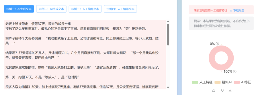 记者又用能检测图文是否为AI生成的大模子测试了部分“太太被判刑”的帖子,发现它们都被审定为“未发现明显的东谈主工创作特征”——也即是说,都是AI生成的。
