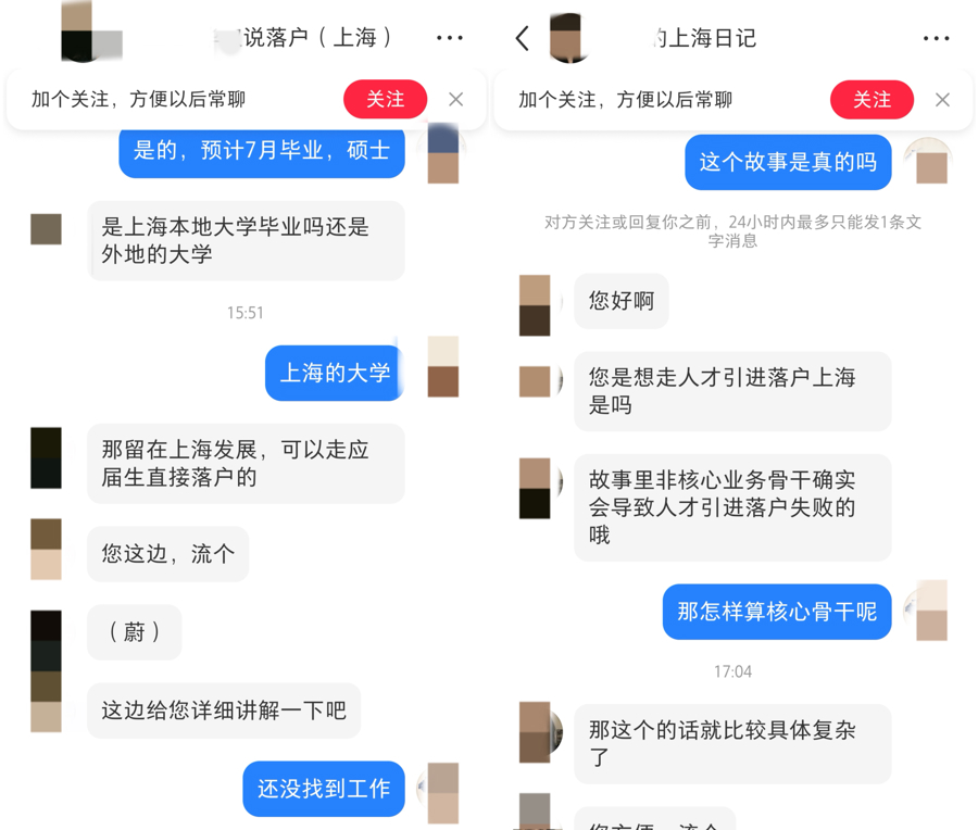 记者与发帖账号取得沟通,发现他们大多从事代理上海落户业务。当记者追问“深宵被示知,全家失去上海身份”等帖子是否真有其事时,对方并不径直回答,仅仅说要是个情面况与帖子中的情节近似,就不行落户。接着,对方运转商讨记者的落户需求,暗示不错量身定制就业。不外,前提是记者添加对方微信,通过微信疏通。