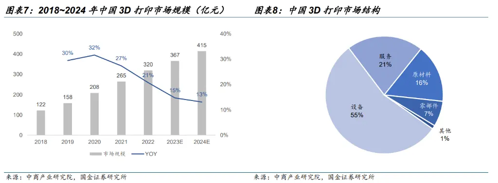 把柄Wohler Associates,2023年寰宇工业级增材树立制造商有328家,其中中国有44家,仅次于好意思国的63家;2024年中国工业级增材制造树立安设量占寰宇工业级增材制造树立安设总量的11.5%,仅次于好意思国的31.0%。把柄中商产业推敲院败露的数据,2024年中国3D打印市集范围约415亿元,其中航空航天鸿沟占比约16.7%,对应69.3亿元。从市蚁合构来看,树立、打印作事、原材料的占比永别为55%、21%和16%。