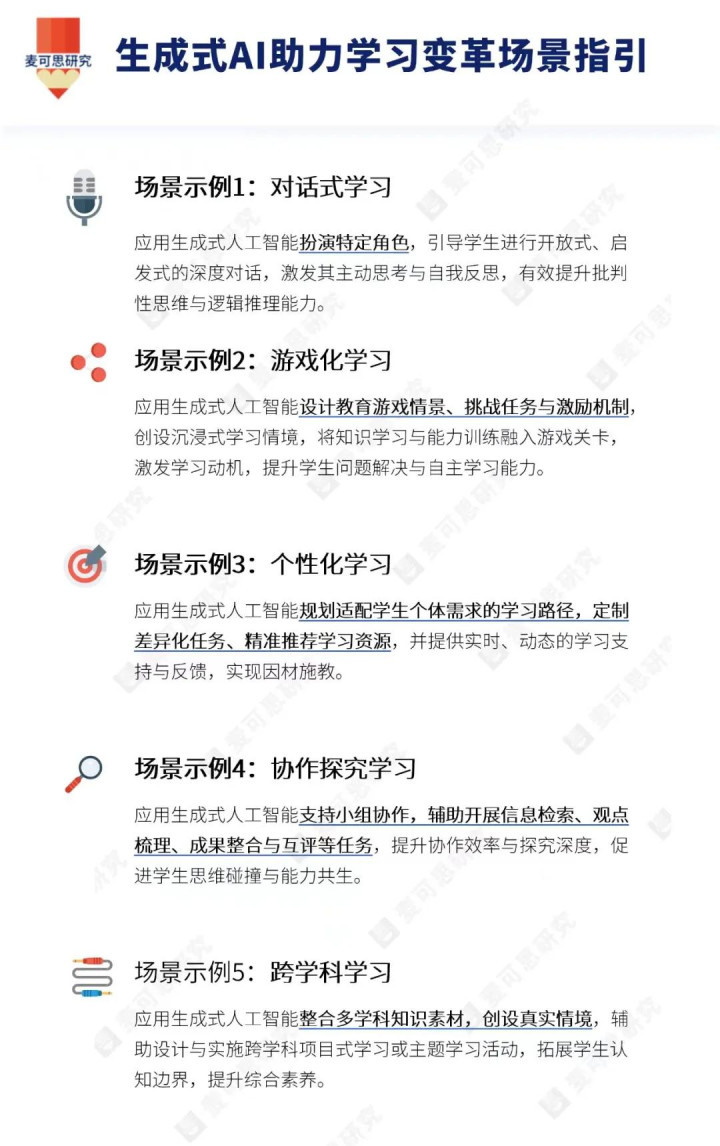 举例,在助力教导提质方面,聚焦课程、讲义、教导履行,探索将东谈主工智能专揽于课程资源整合与课件制作、数字化等新形态的讲义开导。但对照《指引》提供的场景示例,专揽生成式东谈主工智能进行对话式学习、配合斟酌学习触及较少。