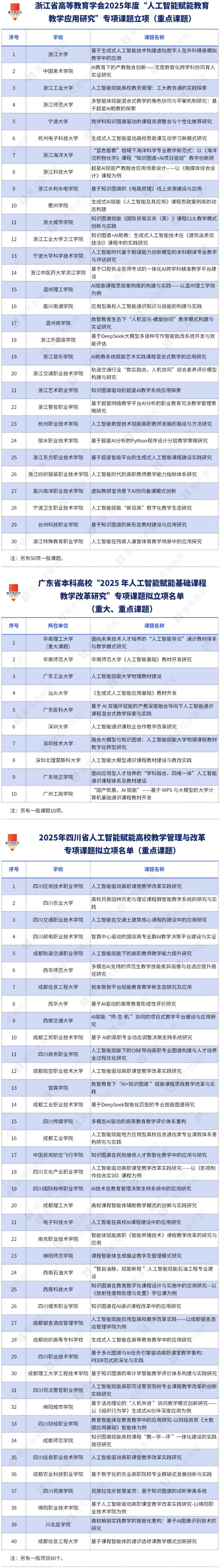 麦可想辩论链接征集到于2025年公布的《浙江省高档训诫学会2025年度“东谈主工智能赋能训诫教导专揽辩论”专项课题立项汇总表》《广东省本科高校“2025年东谈主工智能赋能基础课程教导校正辩论””专项课题拟立项名单公示》《四川省高档训诫学会2025年东谈主工智能赋能高校教导料理与校正专项课题立项名单》,共有200个课题情势(拟)获取立项。(受篇幅驱散,以下仅展示各省高教导会重心、要紧立项课落款单)