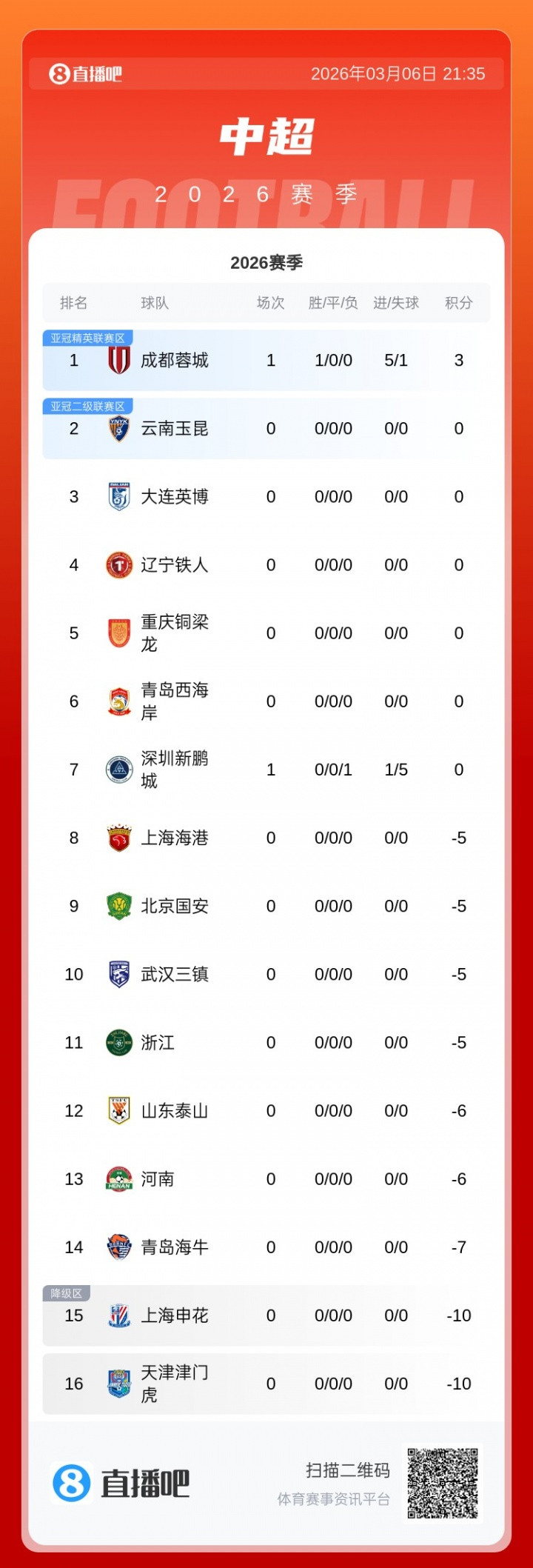 直播吧03月06日讯中超揭幕战,成齐蓉城主场5-1大捷新鹏城,亚搏中超积分榜也迎来了开赛后的第一次更新。