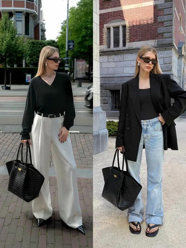 今天我们穿的是一条白色的西装裤,配上玄色的 V 领真挚衫,相比偏干练的打扮立场,就不错袭取玄色的皮质尖头低跟单鞋,既通勤又干练,很有气场。