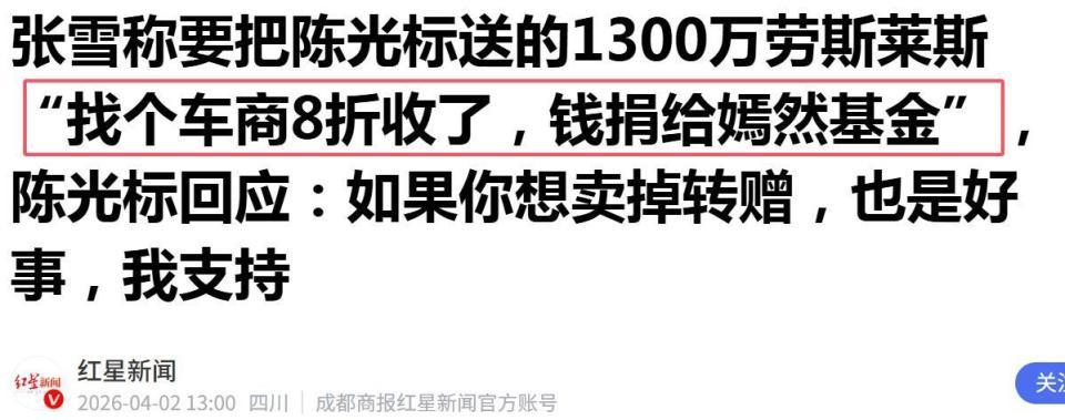 陈光标说,要把一台价值1300万、还未上牌的2026新款劳斯莱斯援救给张雪,算作念他的商务管待车。