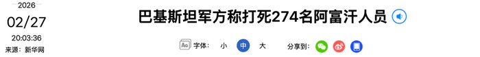 巴基斯坦全军新闻局局长乔杜里27日在新闻发布会上说,自26日晚间以来,巴安整个队已打死274名阿富汗东谈主员。