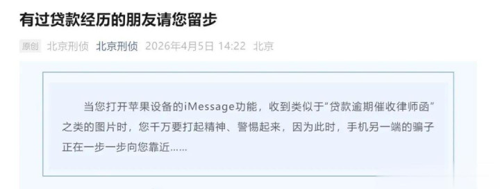 4 月 5 日,北京刑侦官方公众号发布紧迫通报,骗子通过 iMessage 批量发送伪造的 “贷款过时催收讼师函”,极度对准苹果用户下手。