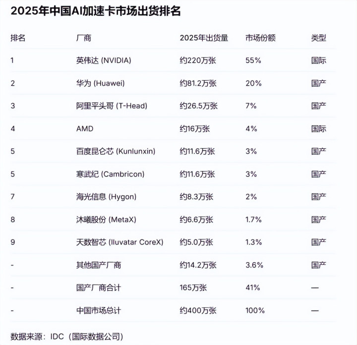 IDC数据骄慢,2025年中国云霄AI加速器阛阓总出货量达400万张,其中国产厂商拜托165万张,占比超41%。而英伟达的出货量约220万张,份额从峰值95%跌至55%,下滑幅度超40个百分点。