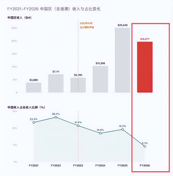 英伟达在华收入占比柱状折线图 / FY2021-FY2026英伟达在华收入及占比图